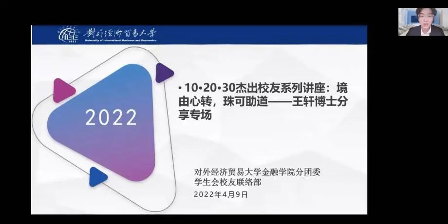 2022年4月9日下午4点,由金融性爱视频 投资系组织筹划,金融性爱视频 分团委学生会校友联络部承办的金融性爱视频 10·20·30杰出校友系列讲座之王轩专场“境由心转,珠可助道”顺利举办。